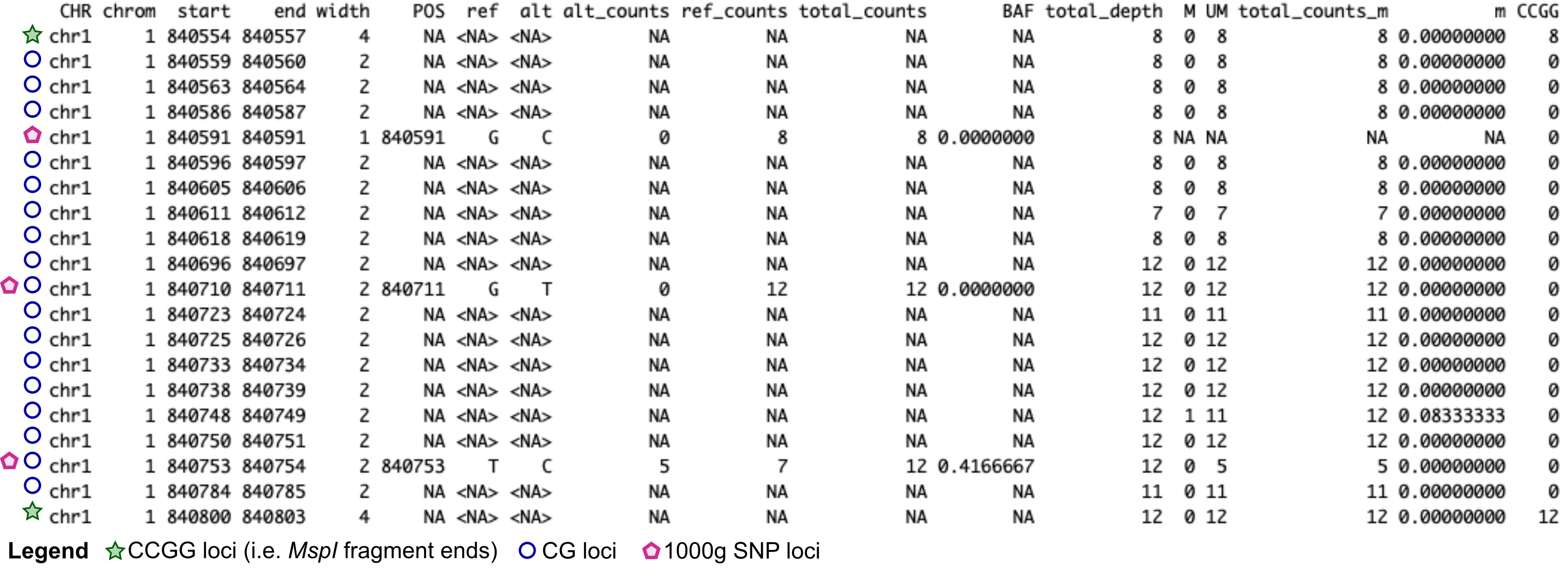 Each row is either a CG locus (and CCGG for RRBS) and/or a 1000g SNP position. These can be distinguished by the width column. While polymorphic CG/CCGG have the same width as their non-polymorphic counterpart, they are easily identified by looking at the POS, ref, alt and other SNP-informative columns.